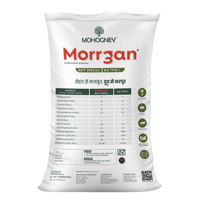 Morrgan Buff Special is expertly formulated for lactating buffaloes across all scales, supporting sustained milk production, strength, and reproductive health. It delivers the energy and protein buffaloes need to perform at their best. Enriched with high fiber content, this feed enhances rumen motility, improves digestion, and supports overall metabolic function – ensuring healthier, more productive animals.